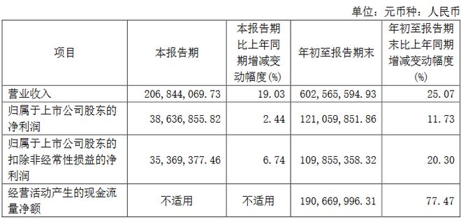 凯格精机前三季度营业收入为5.77亿元,同比增长31.57%;归母净利润4403.79万元,同比增长5.39%。其中第三季度营业收入为2.18亿元,同比增长43.93%;归母净利润1654.13万元,同比增长143.76%。