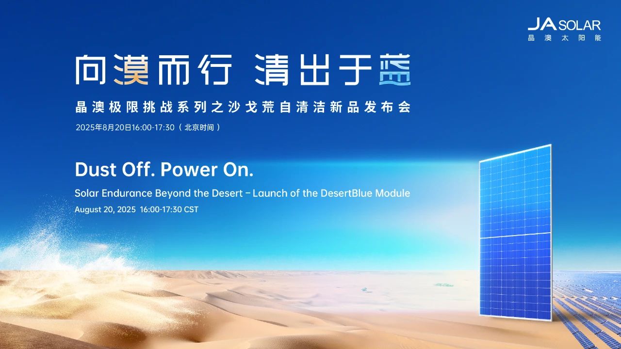 8月20日,“向漠而行 清出于蓝”晶澳科技极限挑战系列之沙戈荒自清洁新品发布会在北京盛大召开。本次发布会云集内蒙古电力勘测设计院、ACWA Power、能建山西院新能源公司等有名的公司,及德国莱茵TÜV、TÜV南德、国检集团等权威机构,共同见证晶澳科技荣耀发布全新“漠蓝”专业组件,开启沙戈荒能源开发效益新时代!