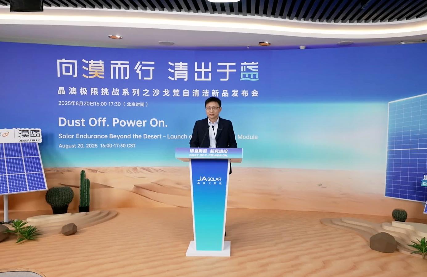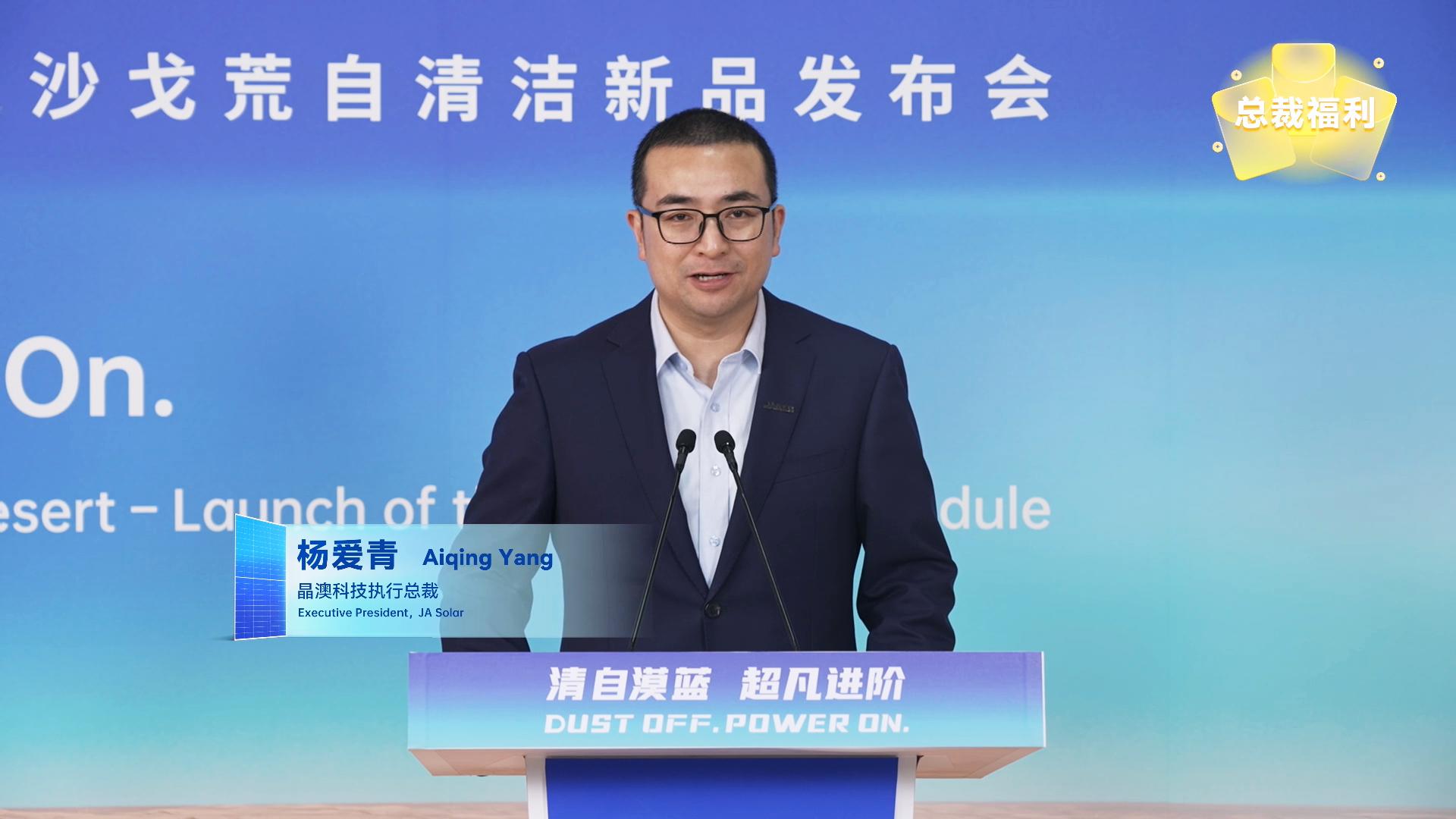 发布会伊始,晶澳科技执行总裁杨爱青为大会作开幕致辞。他表示,沙戈荒占中国国土近27%,同时占全球陆地约25%的面积,当下国家正有序推进沙戈荒大基地和电力外送通道规划建设,中东非地区也掀起了能源与生态双重革命。今天,晶澳科技推出全球首款深度聚焦沙戈荒环境系统性挑战的专业组件“漠蓝”,不仅重构了光伏组件抗沙性能标准,更填补了行业空白。沙戈荒光伏的前景无限光明,而“漠蓝”,正是赋能沙戈荒价值开发的坚实伙伴!