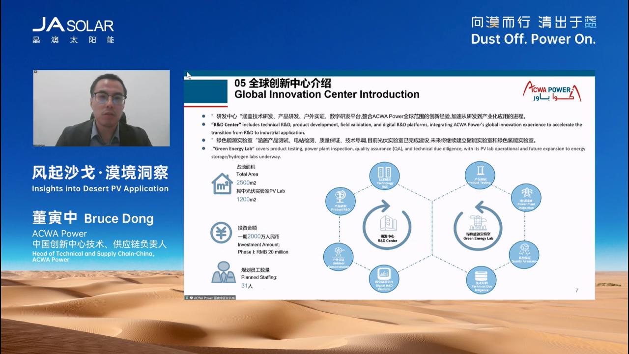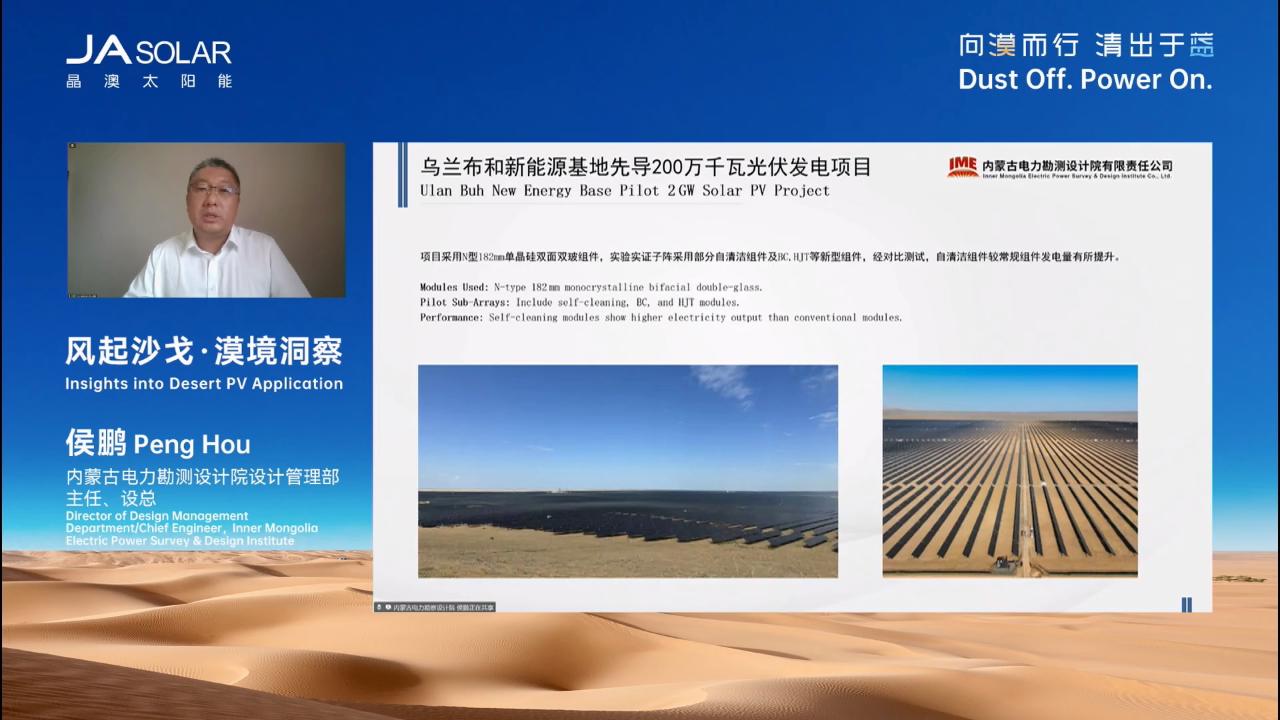 ACWA Power中国创新中心技术、供应链负责人董寅中表示,中东地区太阳能资源优渥,极其适合开发光伏。但在项目实际运行中,因沙尘过载,组件需一天一清扫,导致ARC膜失效,功率衰减严重,同时清洗机器人故障率高、容易脱轨,运维综合成本很高。针对沙戈荒场景开发具有抗灰尘能力的组件势在必行,晶澳创造了又一个行业里程碑。