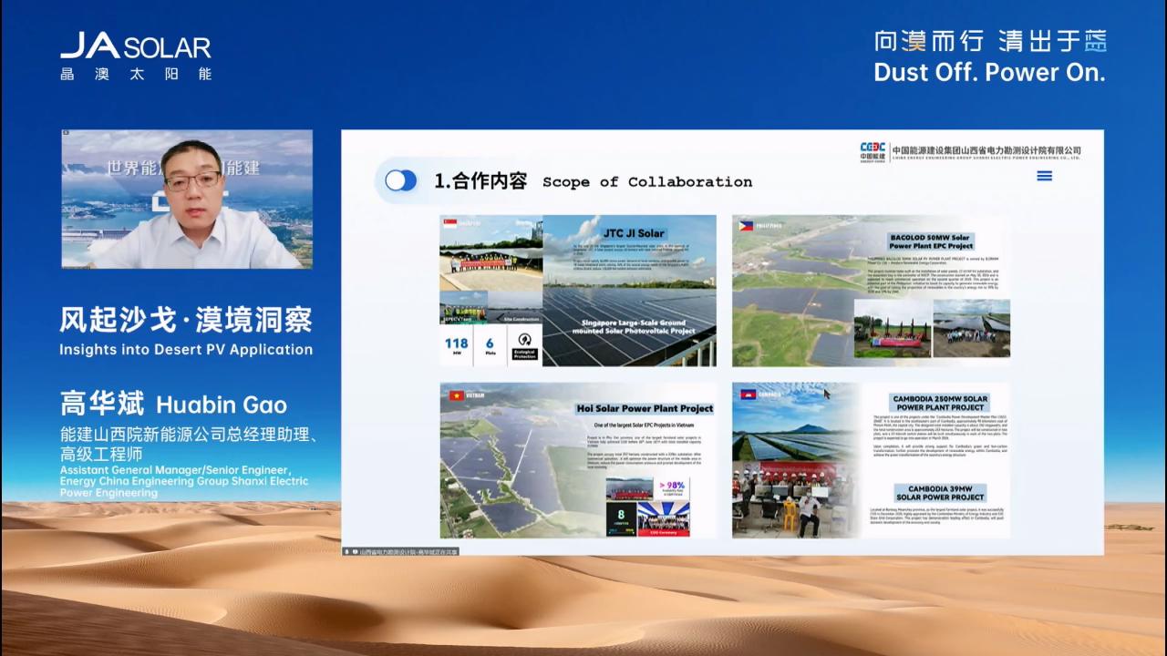 能建山西院新能源公司总经理助理、高级工程师高华斌表示,中亚五国与中东北非地区与我国沙戈荒光伏开发具有相同难点,其中气候极端、施工物流艰难、运维成本高等问题最为尖锐。针对本次“漠蓝”组件发布,能建山西院愿与晶澳共同验证新技术、新产品,共享项目数据,一同推动沙戈荒光伏建设行业标准,提升项目质量和效益。