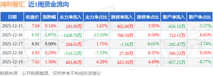 资金流向数据方面,本周鸿利智汇主力资金算计净流出1163.24万元,游资资金算计净流入1620.73万元,散户资金算计净流出457.48万元。本周资金流向一览见下表: